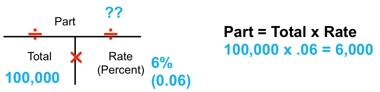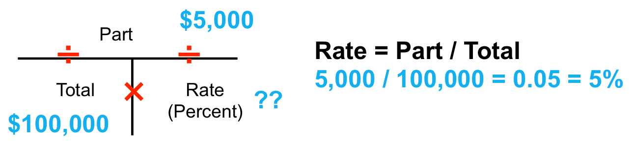 In this example, the total is $100,000 and the part (actual commission) is $5,000. So we use the T-method to see that the commission rate is calculated by $5,000 divided by $100,000 = 0.05 or 5%.