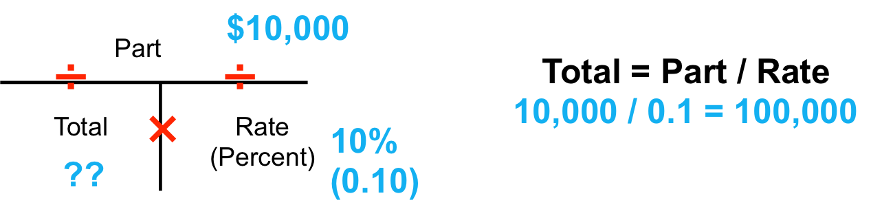 In this example, the part (actual commission) is $10,000 and the rate is 10%. By using the T-method, we see that the total sales price is calculated by dividing the $10,000 by 0.10 = $100,000.